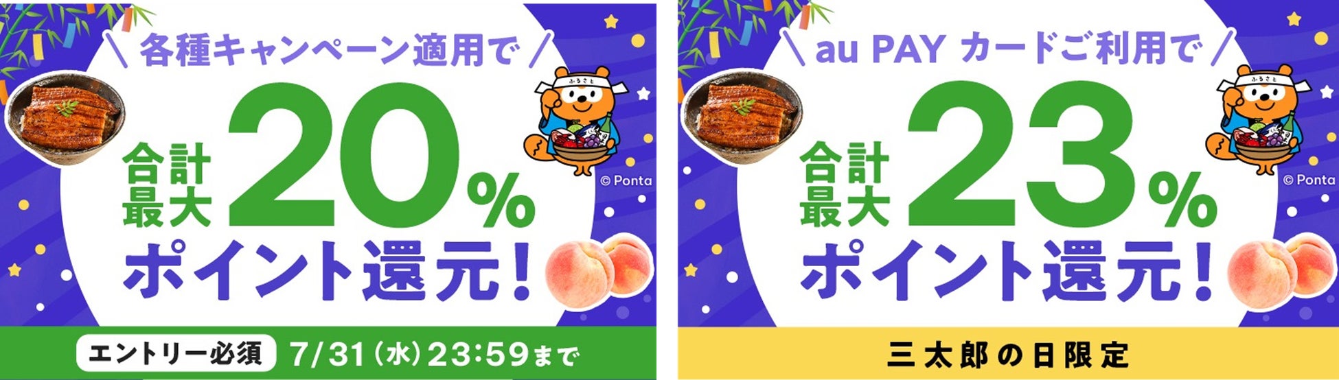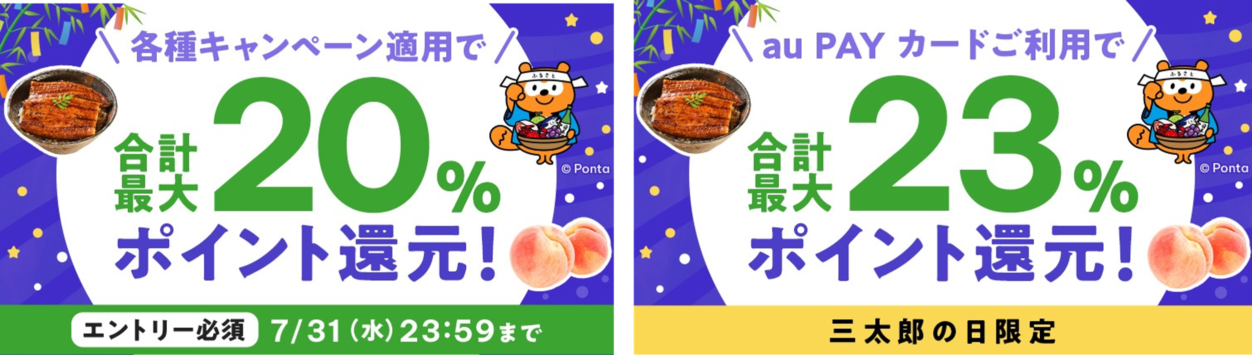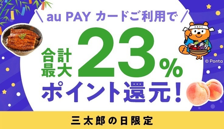 また、「au PAY ふるさと納税」では、7月2日から7月31日までauスマートパスプレミアム会員なら30,000円以上の寄附で、最大4%のPontaポイント(au PAY マーケット限定)を還元する「サマーキャンペーン!ふるさと納税で最大7%ポイント還元!」を開催します。実施中のキャンペーンや特典とあわせると合計最大20%のポイント還元、さらに三太郎の日(毎月3日、13 日、23 日)なら合計最大23%のポイントを還元します。