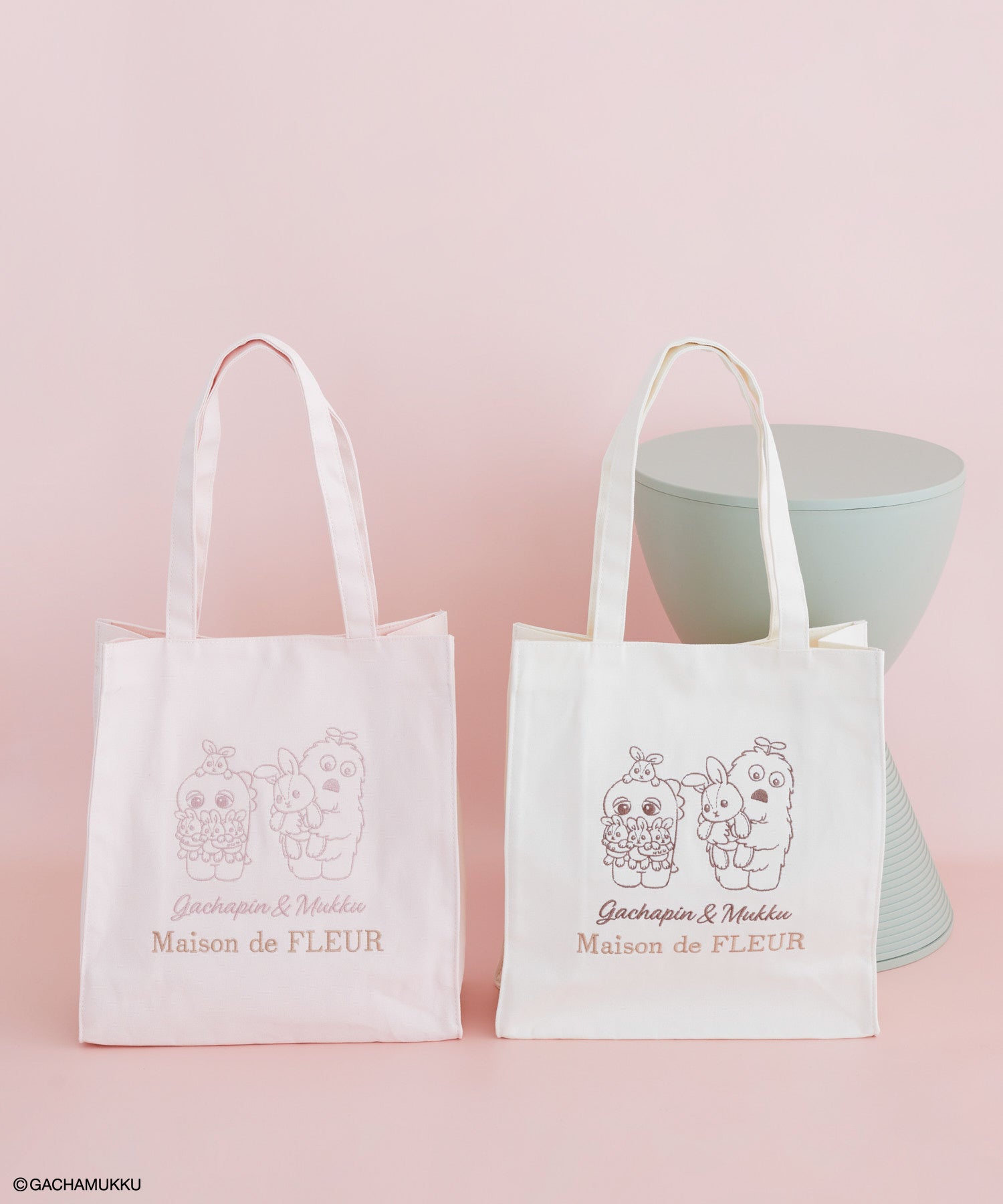 また、Maison de FLEURで人気のうさぎモチーフを刺繍した本コラボならではのアイテムもご用意。キャンバス生地のスクエアトートには、ガチャピン・ムックがうさぎを抱える様子を刺繍。そのほか、ぬいぐるみを背負って振り向く姿が可愛いポーチやタオルハンカチも販売いたします。
