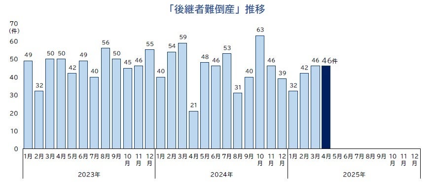 「後継者難倒産」は、46件(前年同月21件、119.0%増)判明し、前年から倍増した。業種別にみると、『サービス業』(12件)が最も多く、『建設業』(11件)や『製造業』(8件)が続いた。「後継者難倒産」のうち、「経営者の病気、死亡」が要因となった倒産は20件判明し、43.5%を占めた。