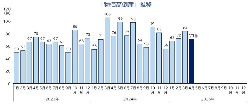 「物価高倒産」は、71件(前年同月76件、6.6%減)判明し、2カ月連続で前年を下回った。業種別にみると、『建設業』(18件)が最多、『小売業』(15件)や『製造業』(14件)が続いた。要因別にみると、「原材料(価格の高騰)」によるものが42.3%で最多、「人件費」が31.0%、「エネルギーコスト」が25.4%で続いた。