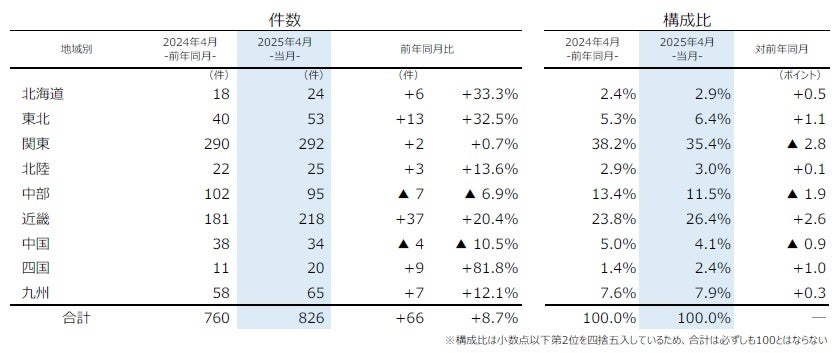 最も増加率が高かったのは、『四国』(前年同月11件→20件、81.8%増)で、特に「徳島」(同1件→5件)と「香川」(同2件→6件)の増加が目立った。『北海道』(同18件→24件、33.3%増)では、2カ月ぶりに前年を上回った。『東北』(同40件→53件、32.5%増)は、4月としては2009年(57件)以来16年ぶりに50件を上回った。
