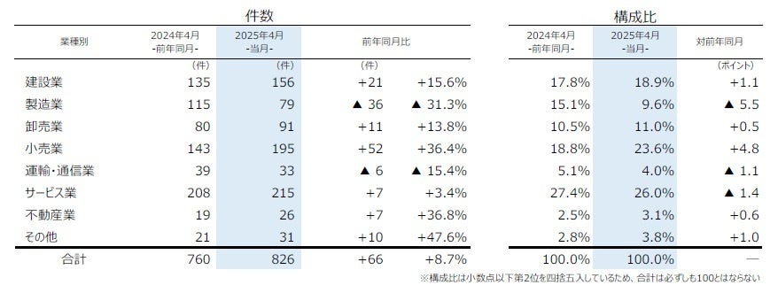 業種別にみると、7業種中5業種で前年を上回った。『サービス業』(前年同月208件→215件、3.4%増)が最も多く、4カ月連続で前年を上回った。次いで『小売業』(同143件→195件、36.4%増)が続き、4月としては『サービス業』『小売業』は2000年以降で最多となった