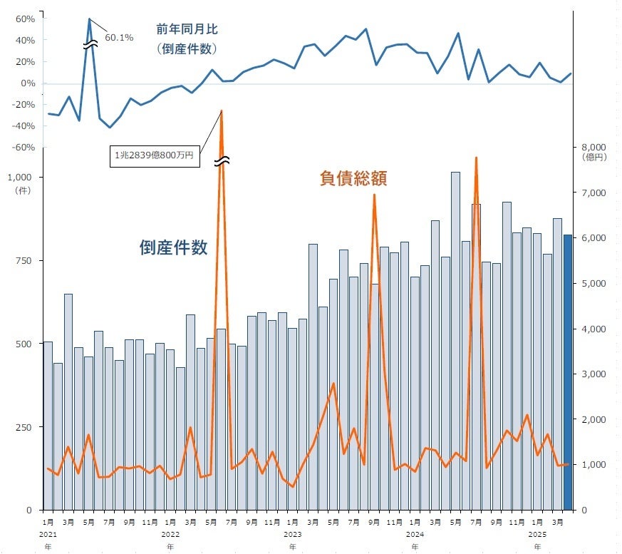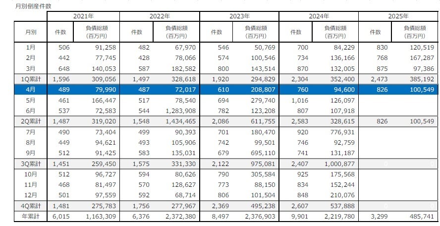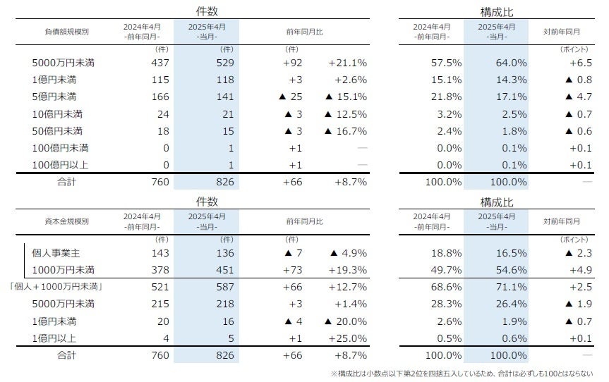 2025年4月の企業倒産は826件 36カ月連続で前年を上回る小規模倒産の増加続く ― 全国企業倒産集計2025年4月報