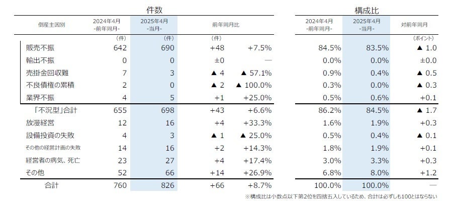 主因別にみると、「販売不振」が690件(前年同月642件、7.5%増)で最も多く、全体の83.5%(対前年同月1.0ポイント減)を占めた。「売掛金回収難」(前年同月7件→3件、57.1%減)、「業界不振」(同4件→5件、25.0%増)などを含めた『不況型倒産』は698件(同655件、6.6%増)となり、36カ月連続で前年を上回った。