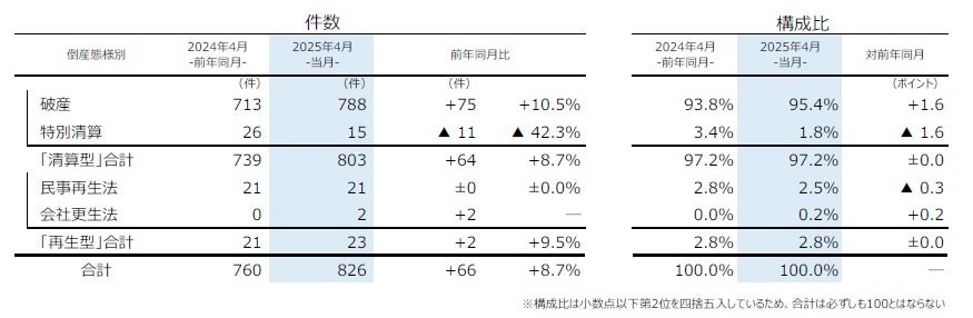 倒産態様別にみると、『清算型』倒産は803件(前年同月739件、8.7%増)となり、全体の97.2%を占めた。4月としては、11年ぶりに800件を上回った。『再生型』倒産は23件(同21件、9.5%増)発生し、2カ月ぶりに前年を上回った。