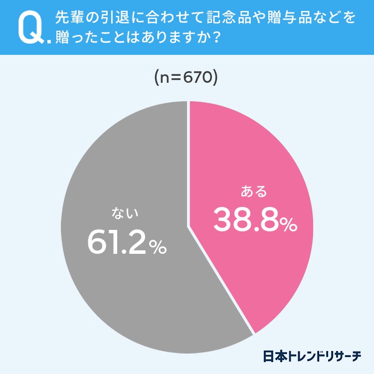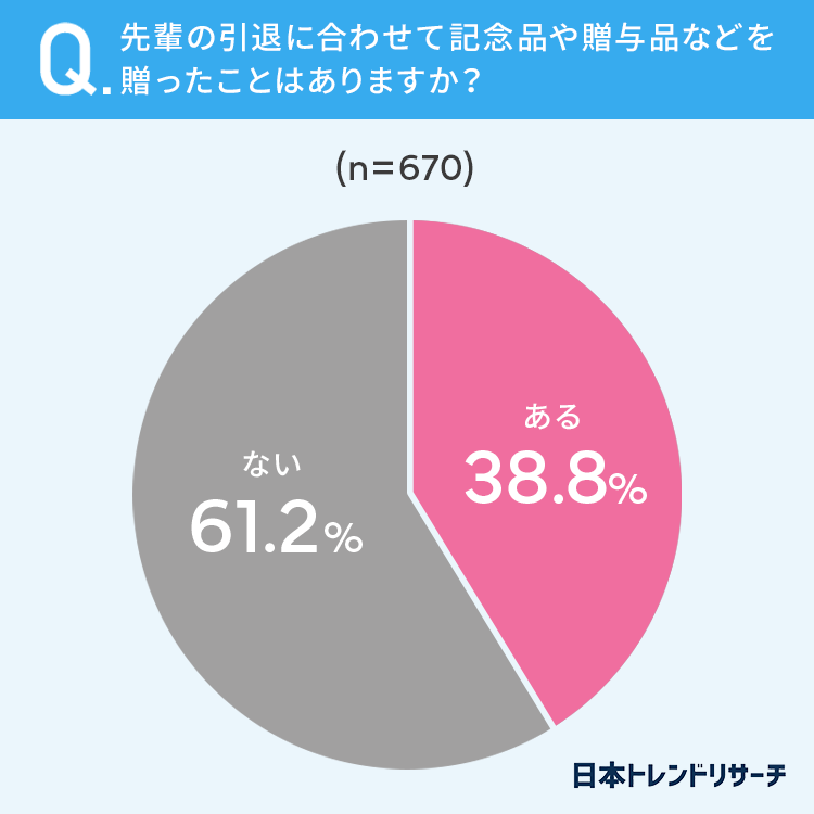 38.8%の方が「先輩の引退に合わせて記念品や贈与品などを贈ったことがある」と回答しています。
