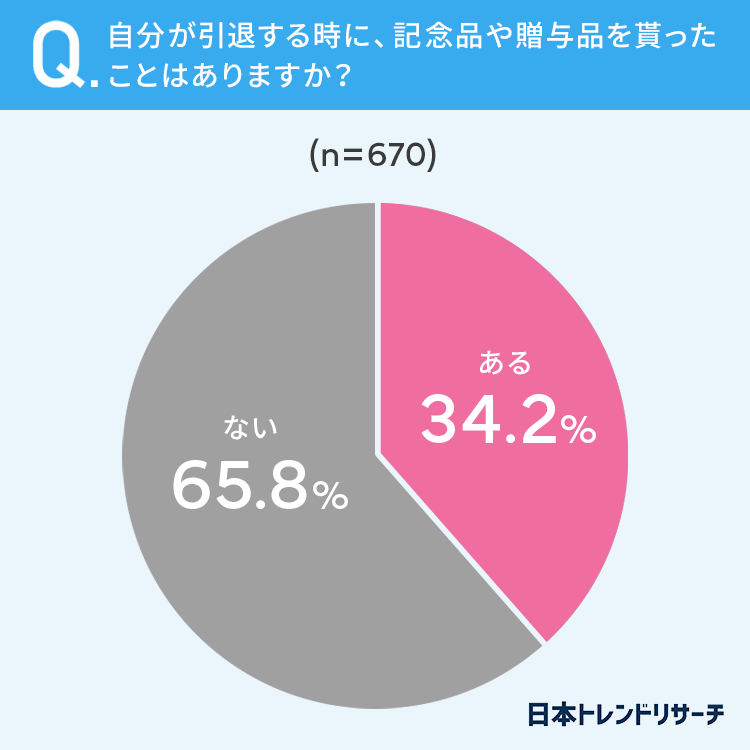 34.2%が「自分が引退する時に記念品や贈与品を貰ったことがある」と回答しています。