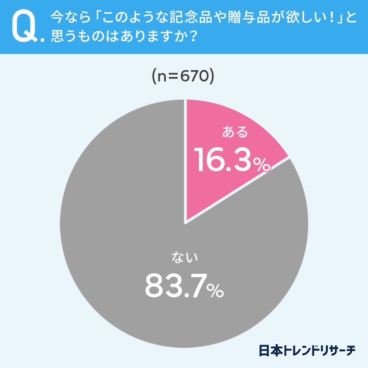16.3%の方が今なら「このような記念品や贈与品が欲しい!」と思うものが「ある」と回答しています。