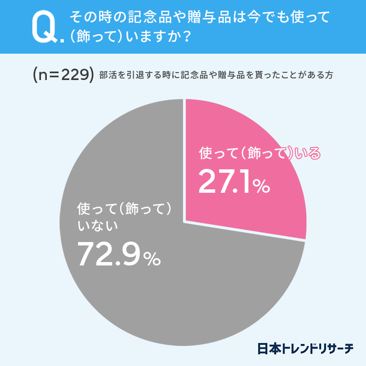 27.1%の方が、部活の引退時にもらった贈与品を「まだ使っている(飾っている)」と回答しています。