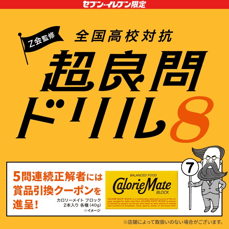 (4)要領 参加者には出題される問題に超良問ドリルLINEアカウント内で回答いただき、5問連続で正解すると、大塚製薬提供の「カロリーメイト ブロック(2本入り)」とお引き換えいただける引換クーポン*を進呈(挑戦できる回数は最大7回までです)。