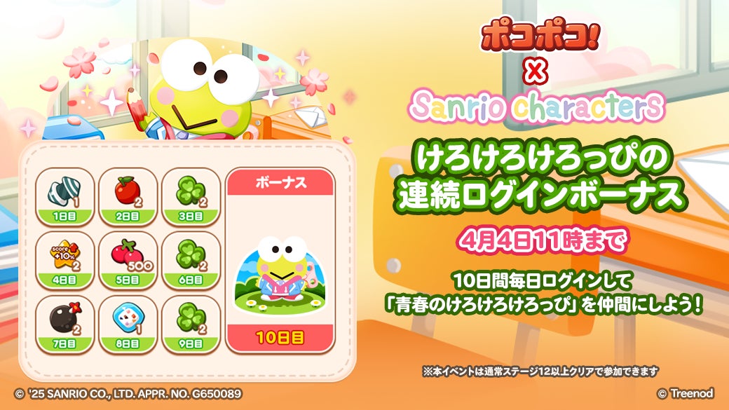 「LINE ポコポコ」に10日間連続でログインすることでコラボオリジナル仲間「青春のけろけろけろっぴ」をプレゼントします。