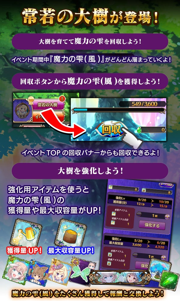 イベント期間中、時間経過で「常若の大樹」に「魔力の雫(風)」が溜まっていき、回収することで「魔力の雫(風)」を獲得することができます。