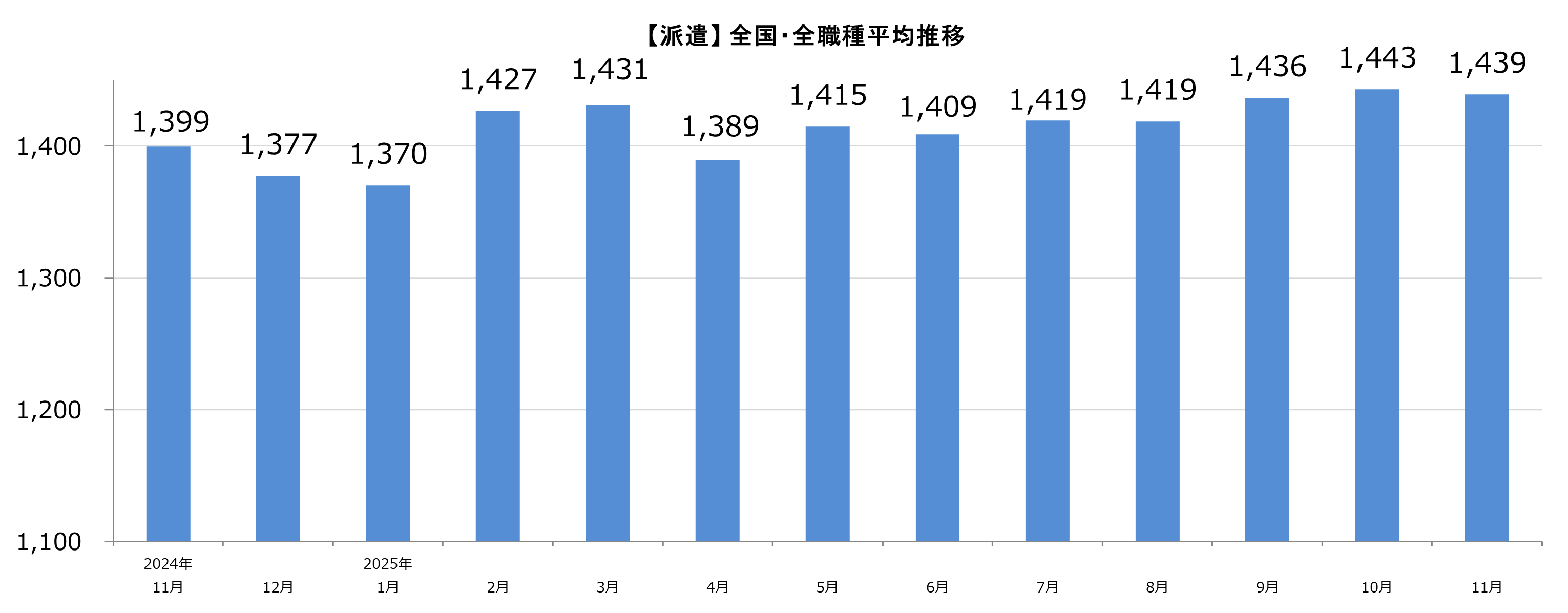 【派遣】全国・全職種平均時給は1,439円。前月比-4円。前年同月比+40円。