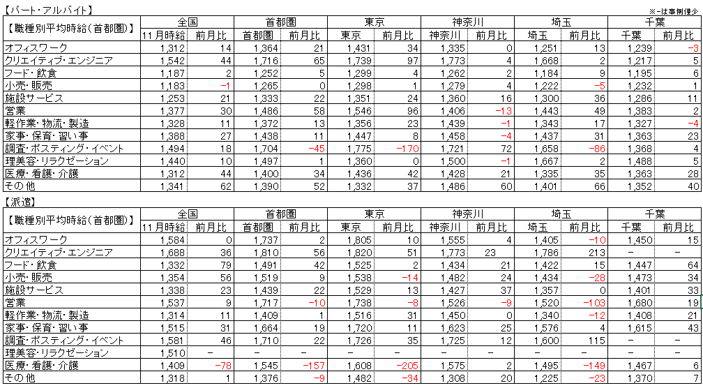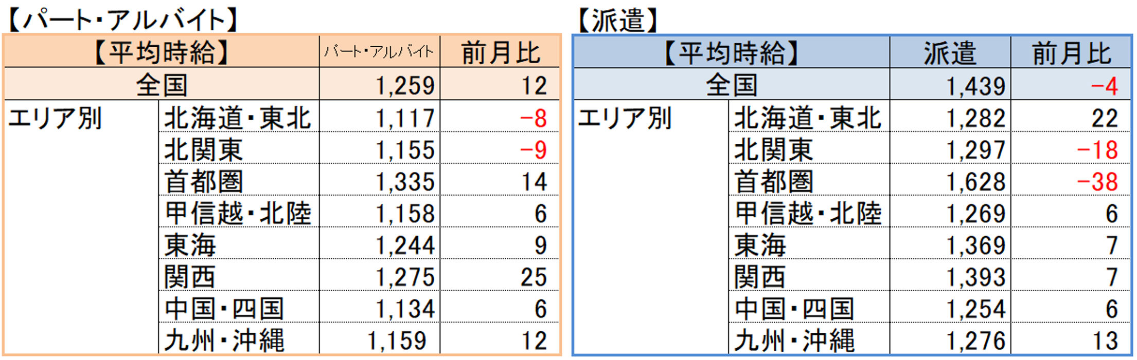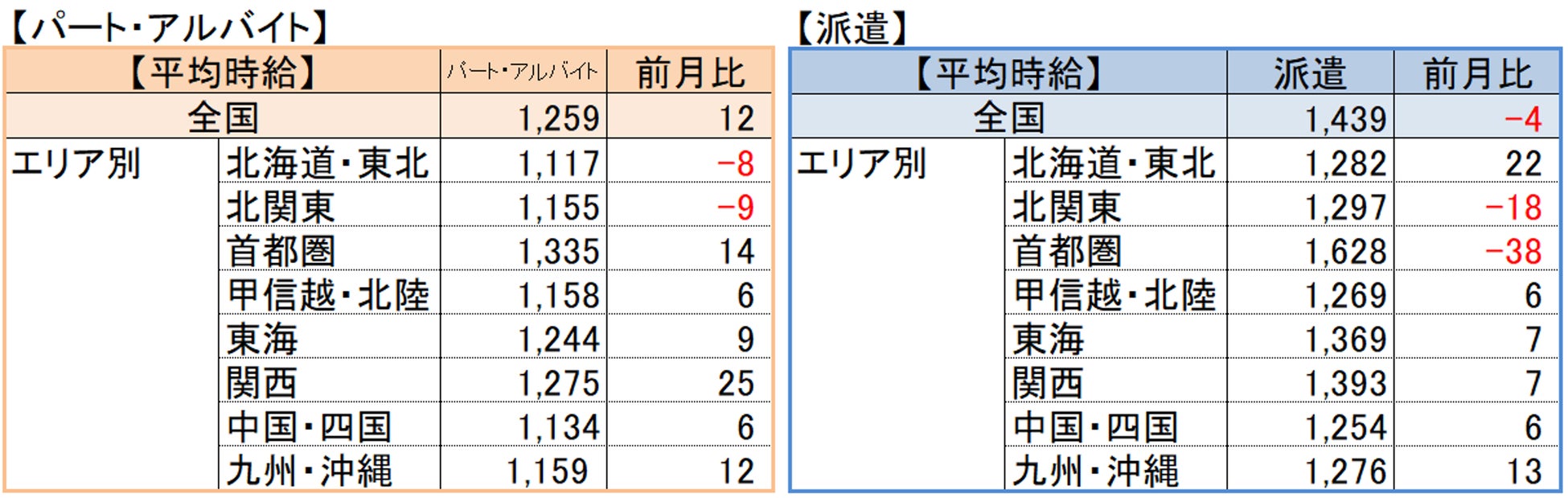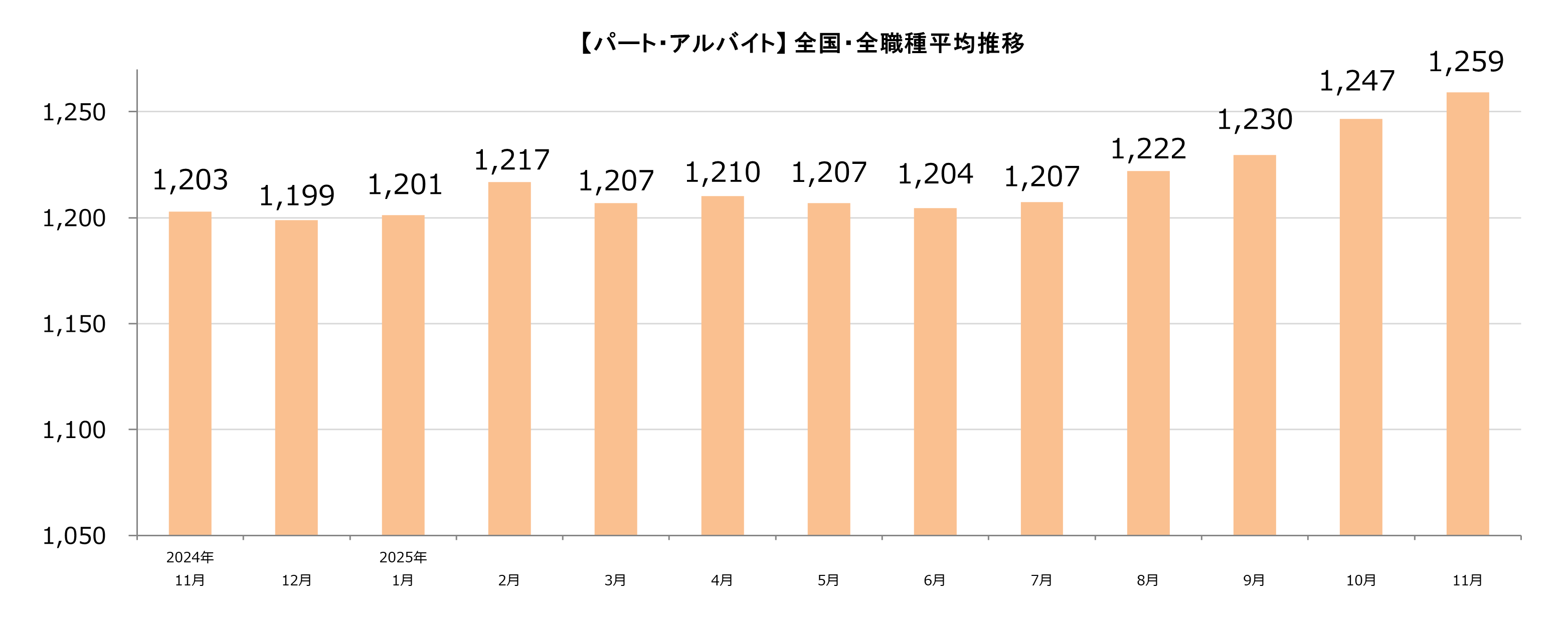【パート・アルバイト】全国・全職種平均時給は1,259円。前月比+12円。前年同月比+56円。