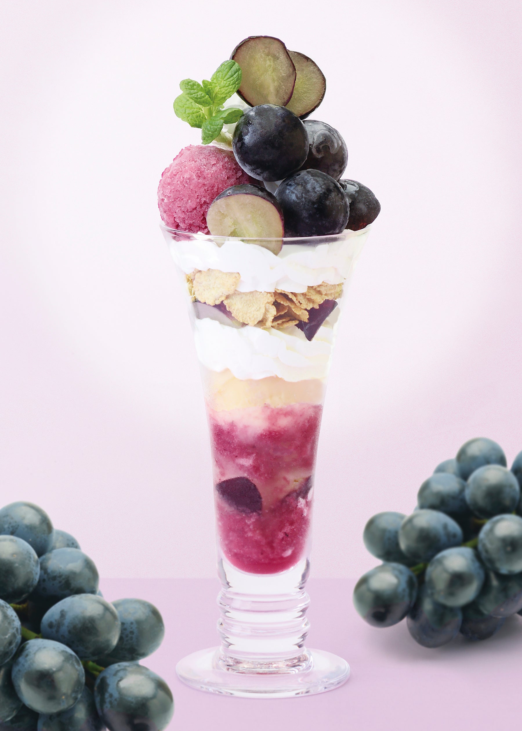 特長:旬のみずみずしいぶどうのおいしさをとじこめた期間限定パフェです。果肉のみずみずしさと自家製ナガノパープルグラニテ(※)の爽やかな甘み&香りに、アイスやクリームのまろやかな乳味が絶妙のコンビネーション。