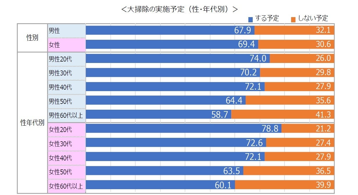 ・大掃除の実施意向率は過去2年と同等の68.7%。若年層の実施意向率が高い結果に