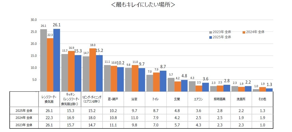 大掃除で特に注力したい場所については「レンジフード・換気扇」が昨年に引き続き1位となりました。2位は「キッチン(レンジフード・換気扇は除く)」で上位を占めました。3位以下は「リビング・ダイニング(エアコンは除く)」、「窓・網戸」、「浴室」と続き、例年通りの傾向に。「トイレ」は微増傾向が続いております。普段使用している水周りや生活空間を年末の大掃除でキレイにしたい人が多い結果となりました。その他、日常では掃除しにくいと考えられる「窓・網戸」が4位と大掃除ならではの場所も上位につけています。一方、「照明器具」は2.8%、「玄関」は4.8%、「エアコン」も3.6%と優先順位が低い結果となりました。