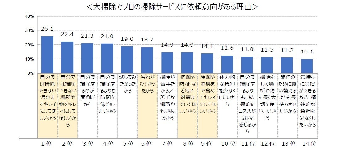 プロの清掃サービスに依頼意向について「自分では掃除できない汚れまでキレイにしてほしい」が1位。「自分では掃除できない場所や物をキレイにしてほしい」が2位となりました。この傾向は、自分の時間を確保するためだけにプロへ依頼するのではなく、プロへの専門性を期待して依頼されていることが見て取れます。次に大掃除の意識として、プロへの依頼意向が高い人は「目に見えない菌などをキレイにしたい」の意識が全体を上回り、大掃除が苦手という意見は全体を下回りました。大掃除が苦手だからプロに頼むのではなく、掃除の仕上がりへのこだわりや、自身の時間の節約など合理的な選択が増えていることが推測できます。