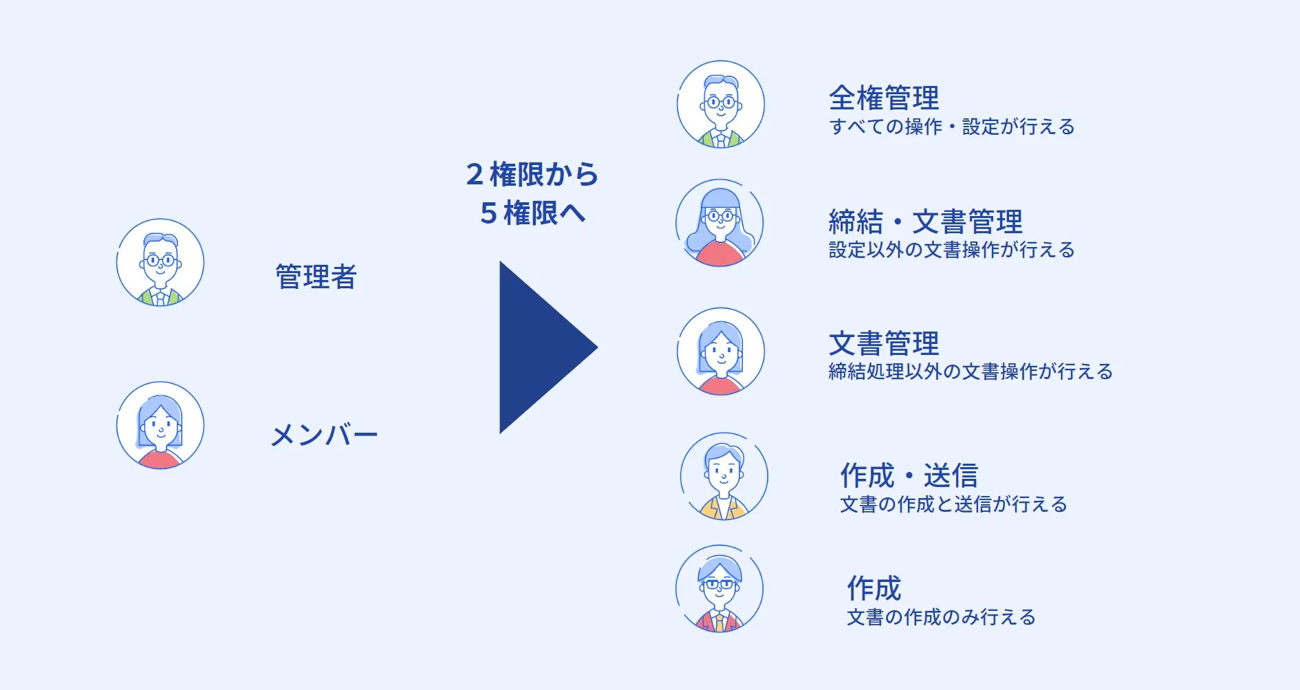 これまで「管理者」と「メンバー」の2種類だった権限設定種類が5種類に増え、より柔軟に権限設定を行うことが可能になりました。契約書をはじめとした文書の作成から管理までの操作過程で、これまで権限制御がなかった操作にも権限制御を導入し、細かな権限設定を実現しました。