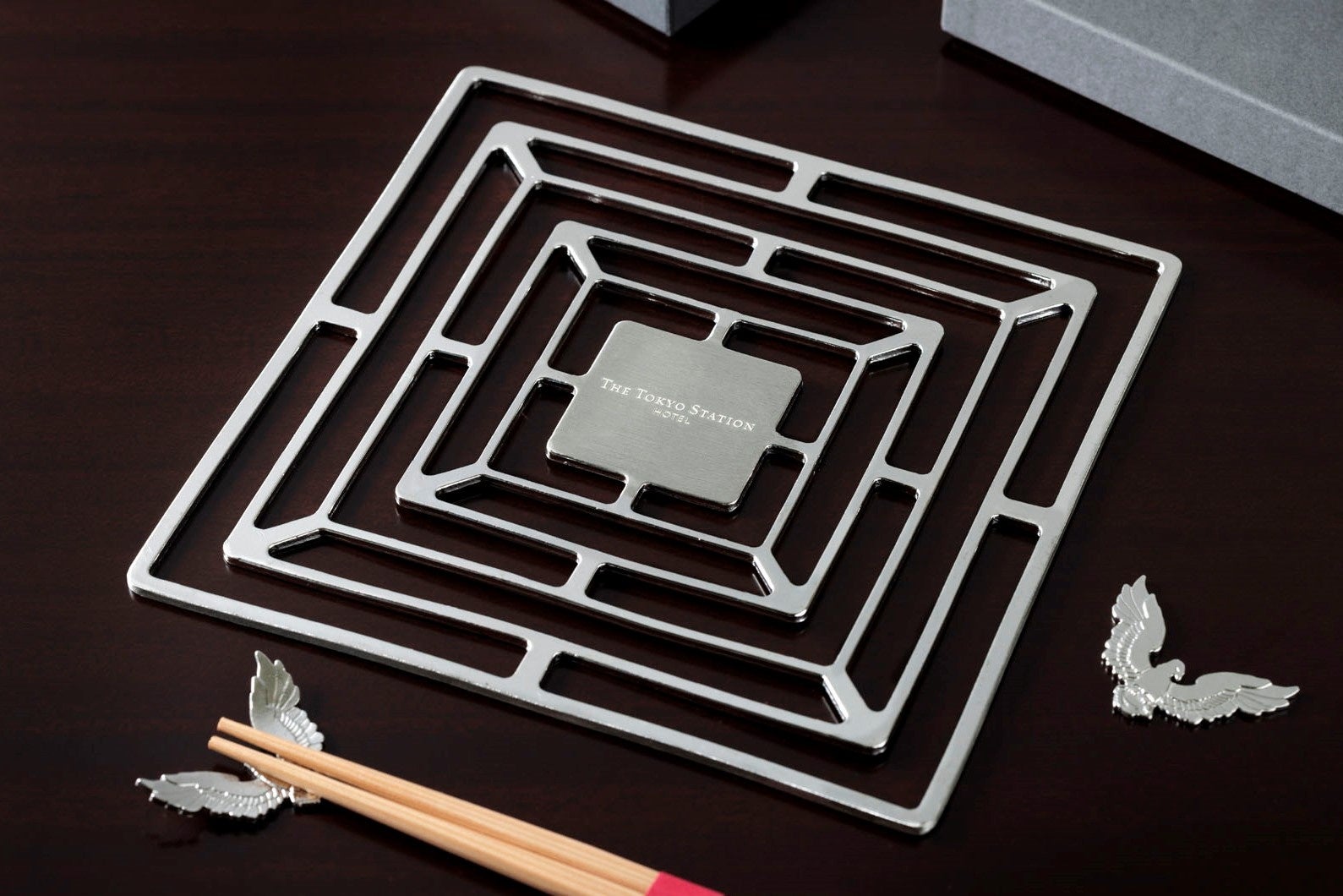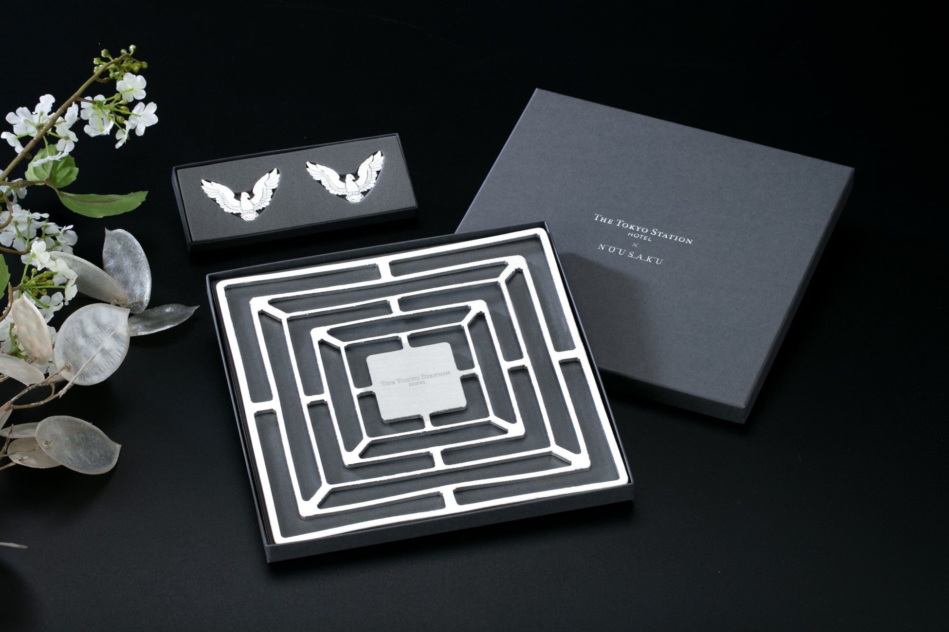 特典:錫100%製 ホテルロゴ入りKAGO - スクエア 1 個 & 錫100%製 箸置 - 大鷲 2 個