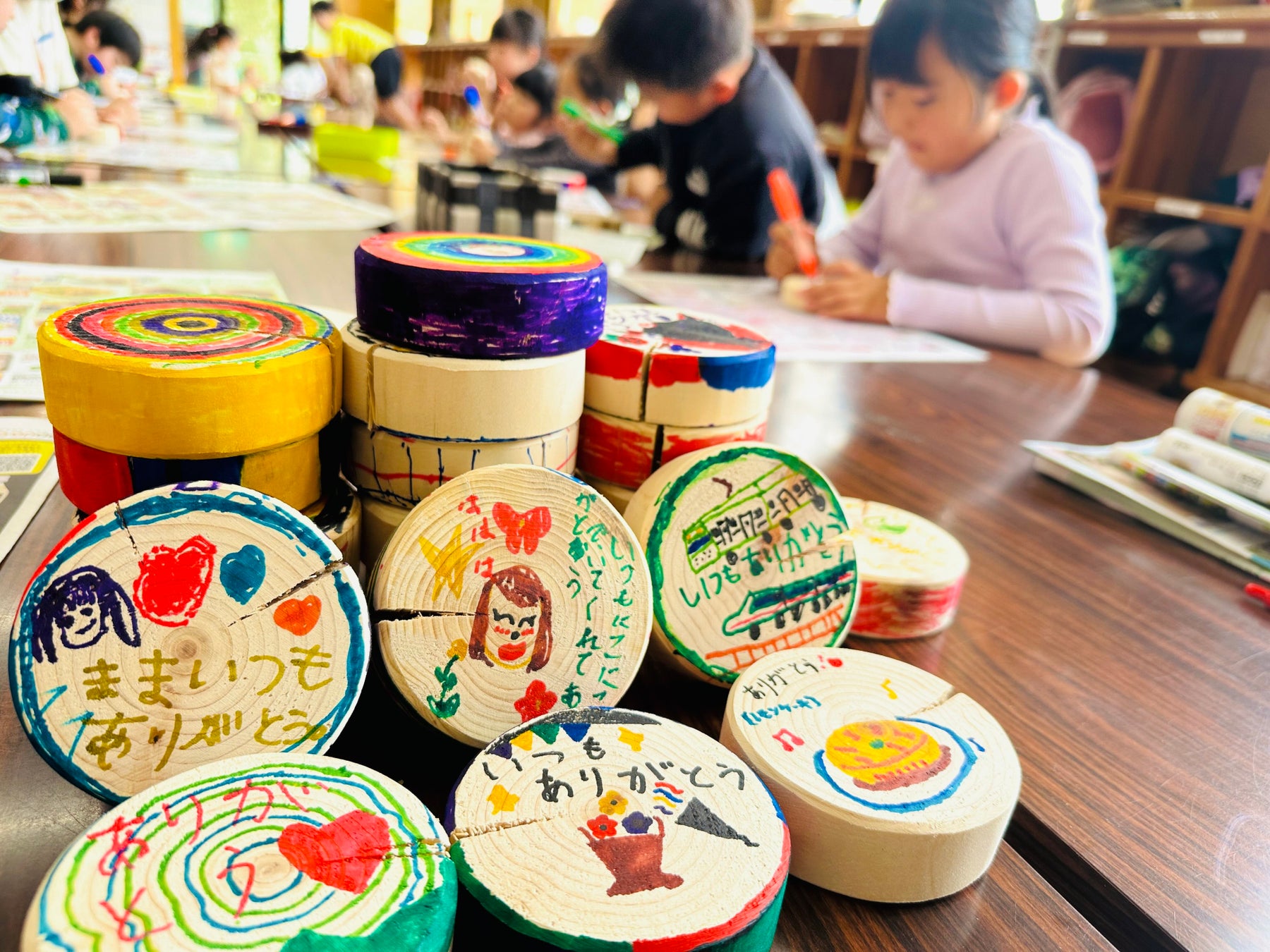 昭和レトロな温泉銭湯 玉川温泉の「母の日イベント」に向けて、ときがわ町学童保育の子供たちが地元産ヒノキ入浴木にメッセージを書きます