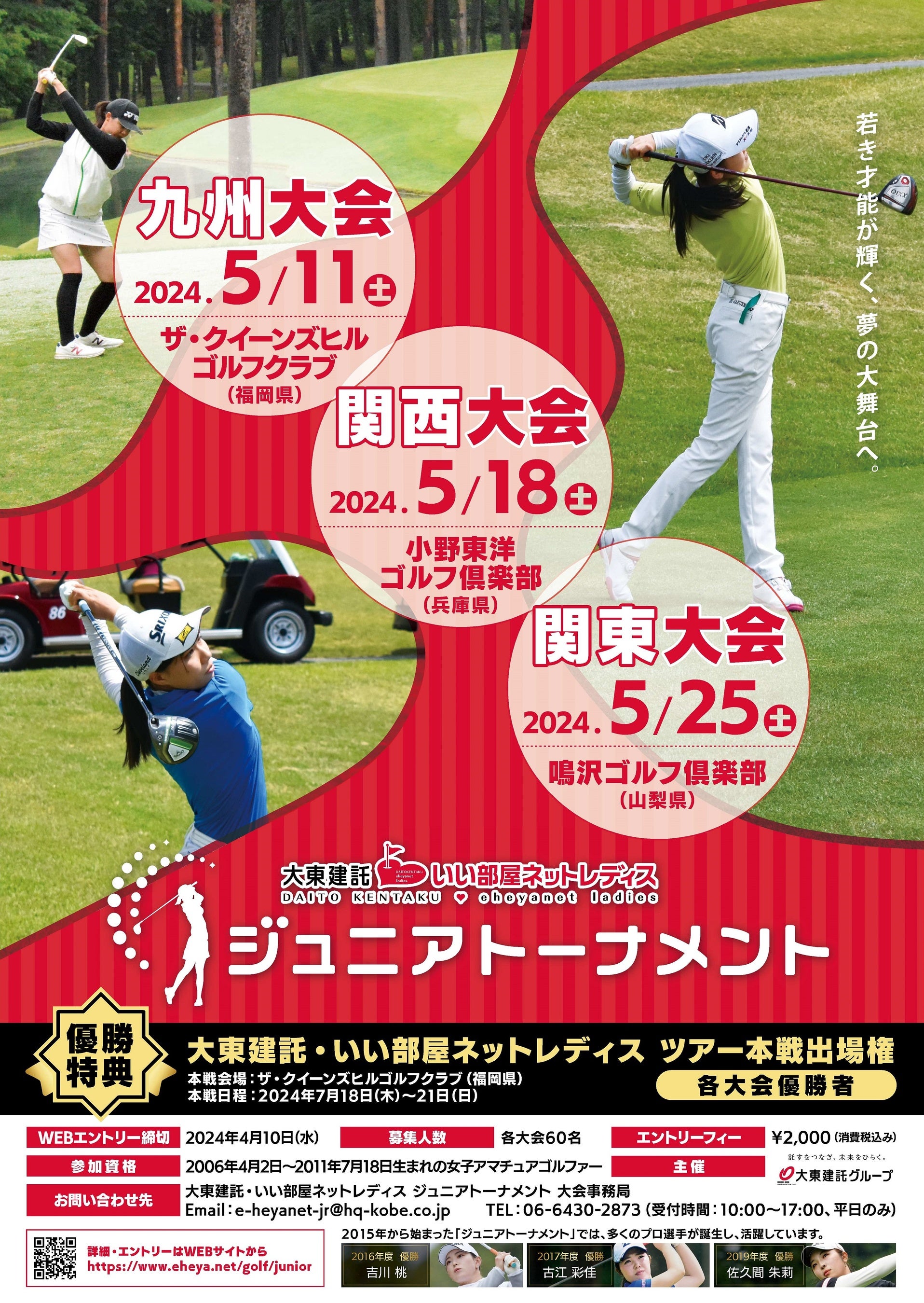 9回目となる今回は、九州大会(ザ・クイーンズヒルゴルフクラブ/福岡県糸島市)、関東大会(鳴沢ゴルフ倶楽部/山梨県鳴沢村)の他、新たに関西大会(小野東洋ゴルフ倶楽部/兵庫県小野市)を加えた全3大会を開催します。なお、各大会の優勝者には、2024年7月18日(木)から7月21日(日)の4日間、九州大会の会場でもあるザ・クイーンズヒルゴルフクラブで開催される、当社グループ主催のJLPGA