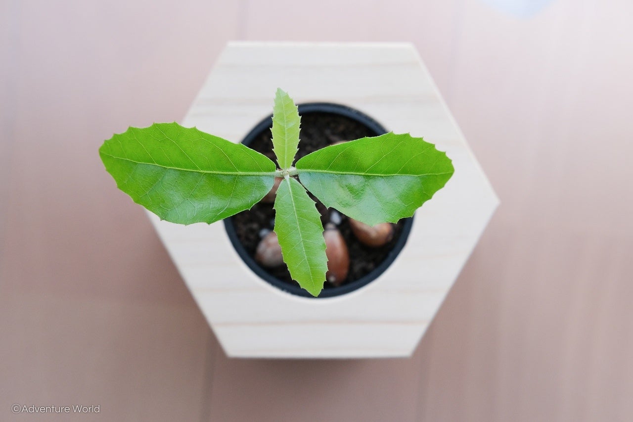 MODRINAEは、誰もが山づくりに参加できる新しい観葉植物です。どんぐりから苗木を育てるセットになっており、購入者の元で育った苗木は、ソマノベースが引き取り山へ植林します。育てる期間は約2年間。その後、苗木が植林される和歌山県の木材を使用した製品を購入することも可能です。