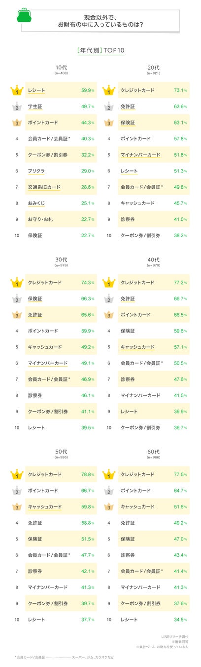まず、20代以上では、すべての年代で「クレジットカード」が7割を超えて1位ですが、10代では「レシート」が約6割で1位でした。