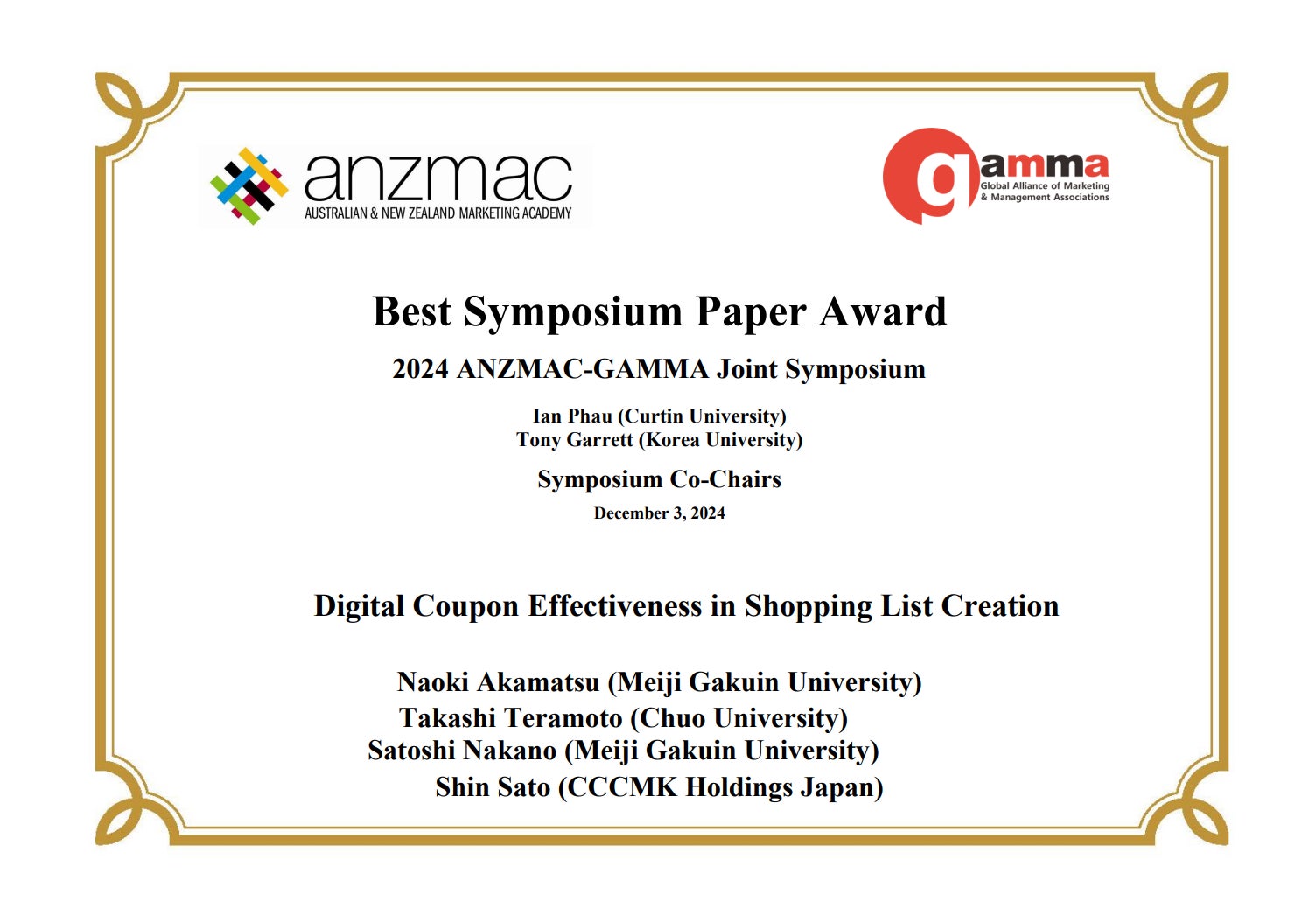 CCCMKホールディングス株式会社(本社:東京都渋谷区、代表取締役社長 兼 CEO:髙橋 誉則、以下「CCCMKホールディングス」)のCCCマーケティング総合研究所に所属する佐藤 伸の共著論文 “Digital Coupon Effectiveness in Shopping List Creation” が、国際学会2024 ANZMAC-GAMMA Joint Symposiumにて「Best Symposium Paper Award」を受賞しました。