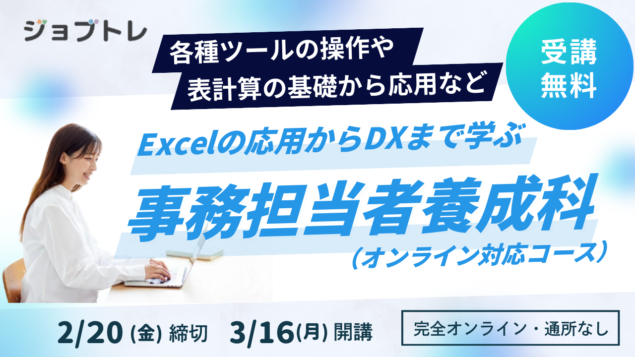 【未経験OK】事務のスキルを学べる求職者支援訓練「Excelの応用からDXまで学ぶ事務担当者養成科」3/16開講!受講生募集開始