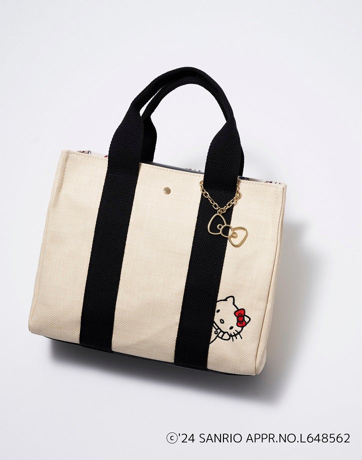 夏らしい雑材を用いたスクエア型トートバッグ。ちらりと覗かせたハローキティの刺繍は、メタリックの糸を使用した甘すぎないデザインなので、大人の女性が持ちやすいのも魅力です。取り外し可能なショルダーストラップ付きの2WAY仕様です。