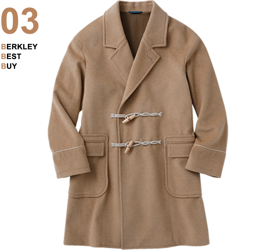 ポロ競技の選手や試合を観戦する貴族が着用していた外套をルーツとするポロコートを、BERKLEYではボタンをダッフルコートなどに用いられるトグル釦にアレンジ。フレームドパッチポケット・バックベルトなど存在感のあるディテールがポイントです。
