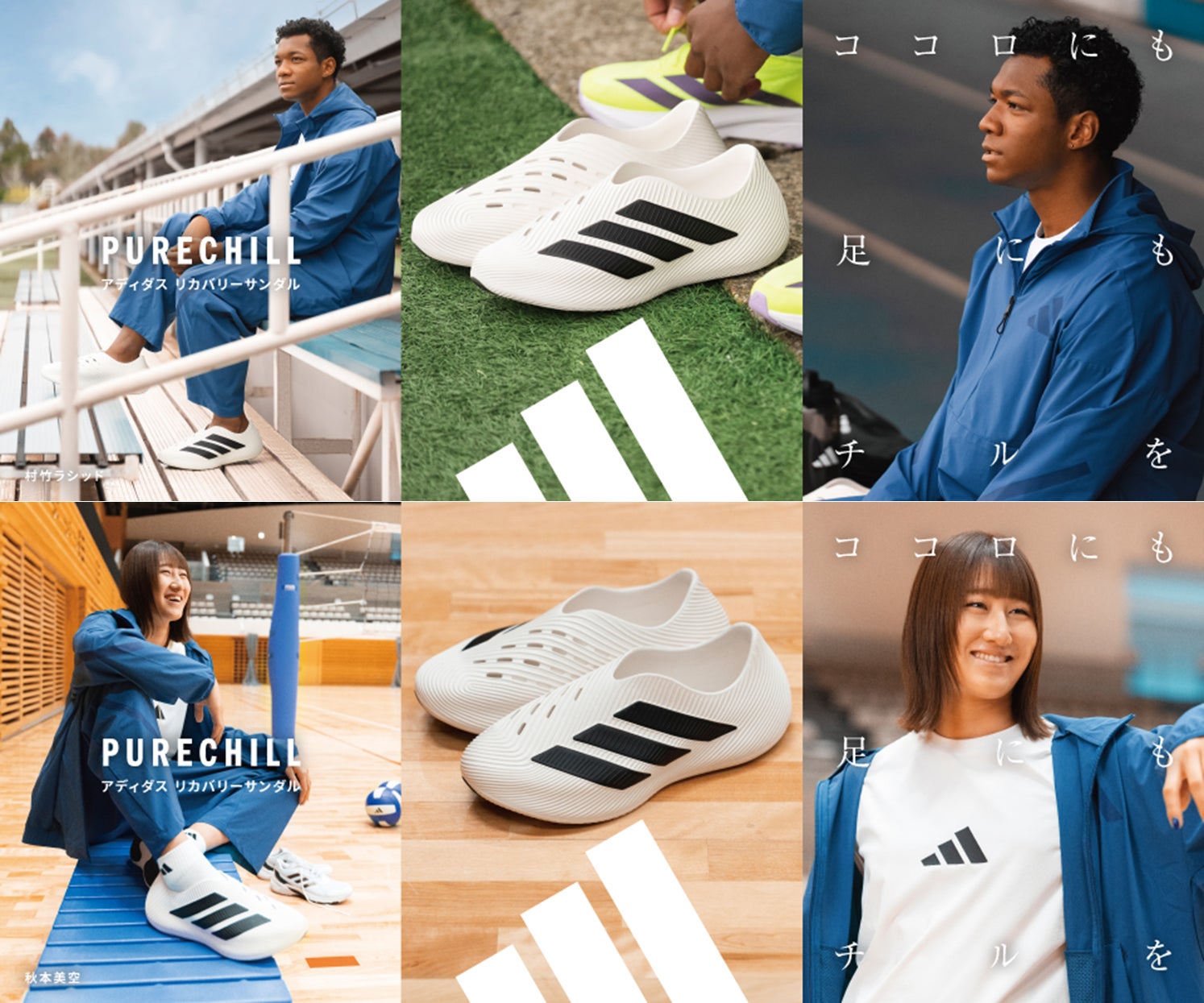キービジュアルには、陸上競技の村竹 ラシッド選手とバレーボールの秋本 美空選手を起用。厳しいプロアスリートの世界でグローバルに活躍する二人が、練習後に「PURECHILL」を着用してチルタイムを過ごすシーンは、試合や練習時の闘志みなぎる表情とは違う、ココロも足もリフレッシュしたやわらかな表情になっています。