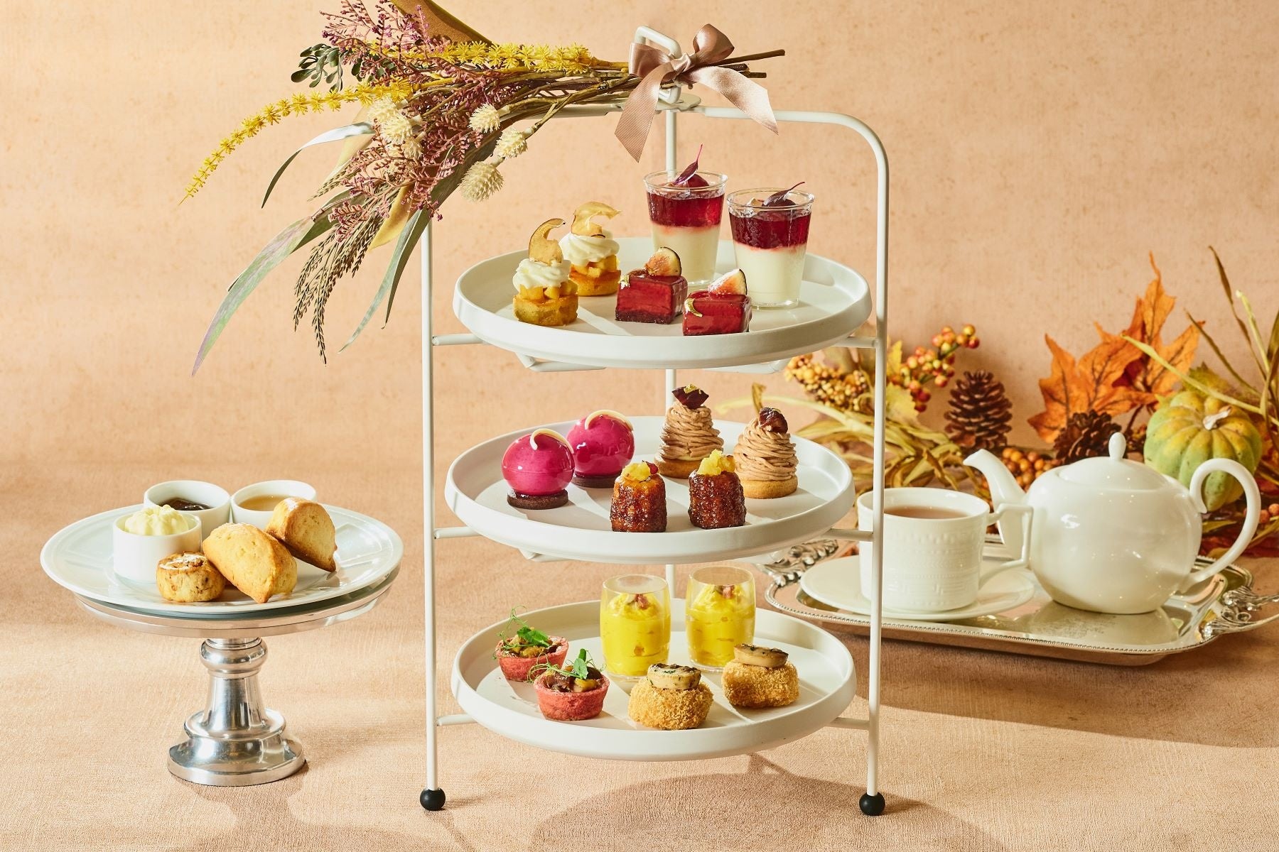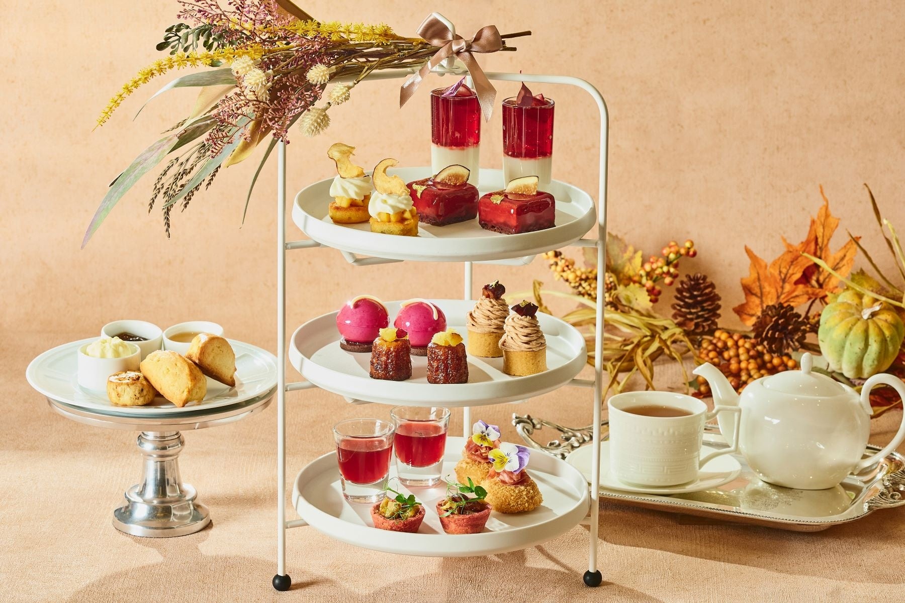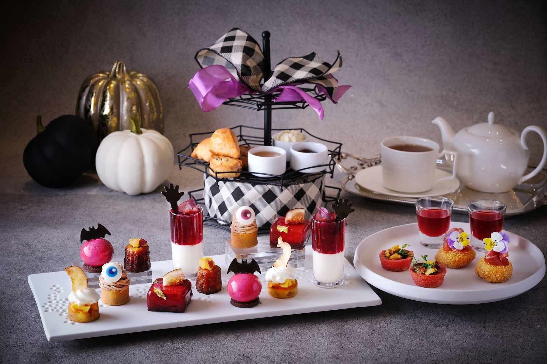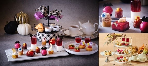 スイーツは、お化けモチーフが可愛らしいカシス香るモンブランや、ザクロとブドウのジュレ、酸味を効かせたカシスのムース、また、繊細なりんごのキャラメリゼを飾ったさつま芋のケーキ、艶やかなラズベリー色の濃厚ショコラムース、芋の甘露煮を飾ったしっとりしたカヌレなど秋の味覚を使用した計6種をご用意。特製セイボリーは、ビーツがほんのり香る牛肉のコンソメ、トリュフときのこを使い生ハムを添えた贅沢なライスコロッケ、秋の味覚の栗を使用した一口キッシュの3種をご堪能いただけます。 ※ストリングスホテル 名古屋、セントグレースヴィラはメニュー内容が多少異なります