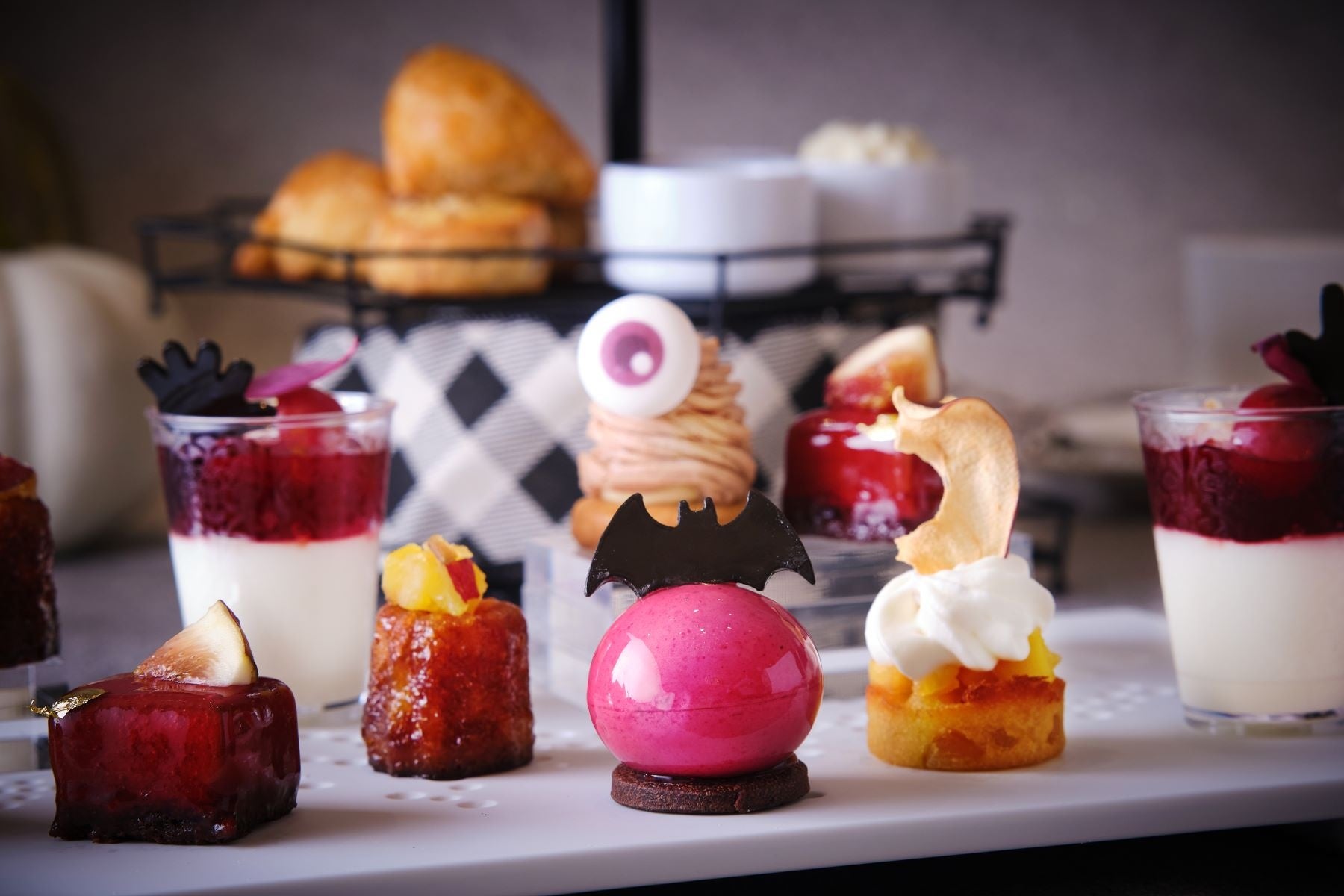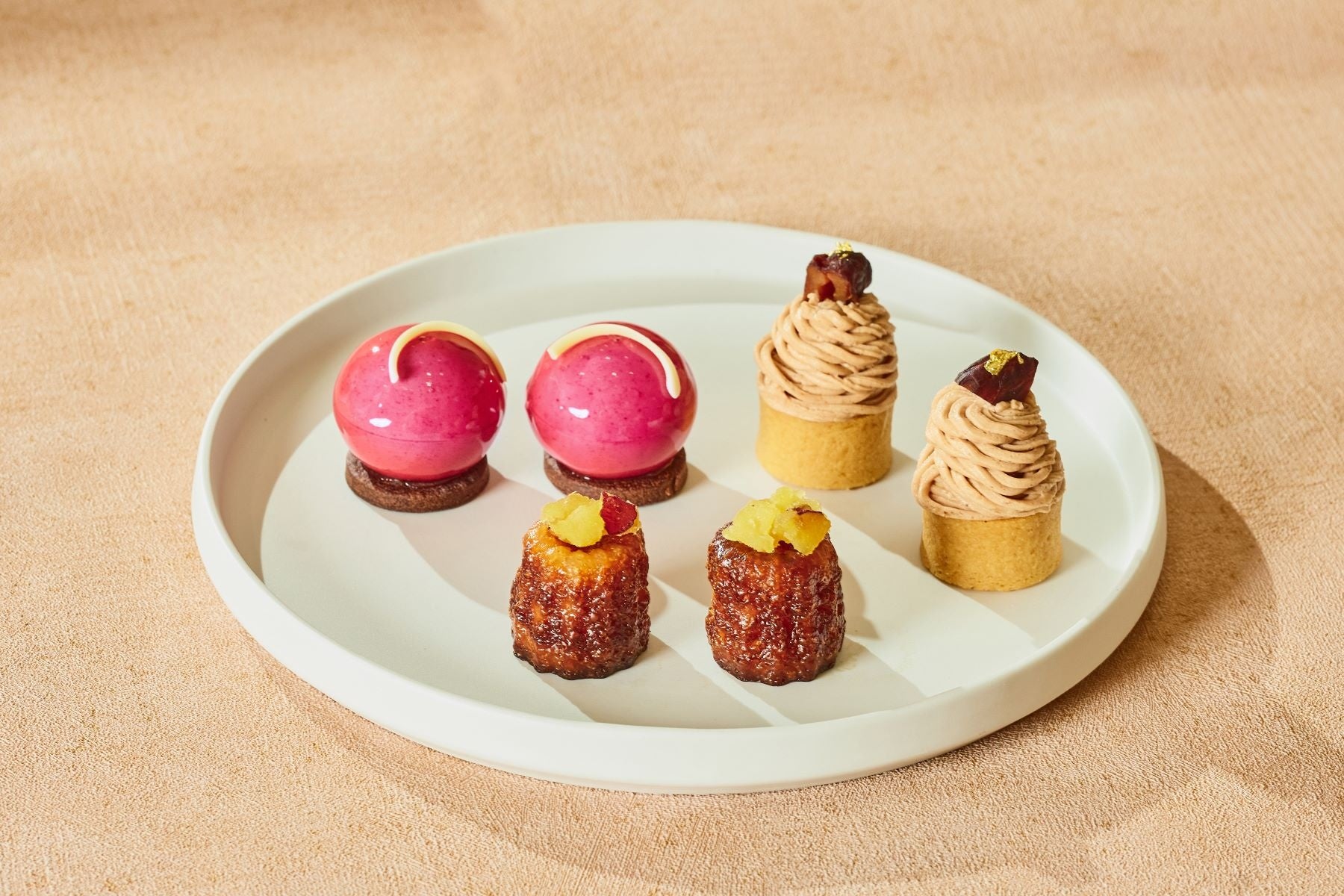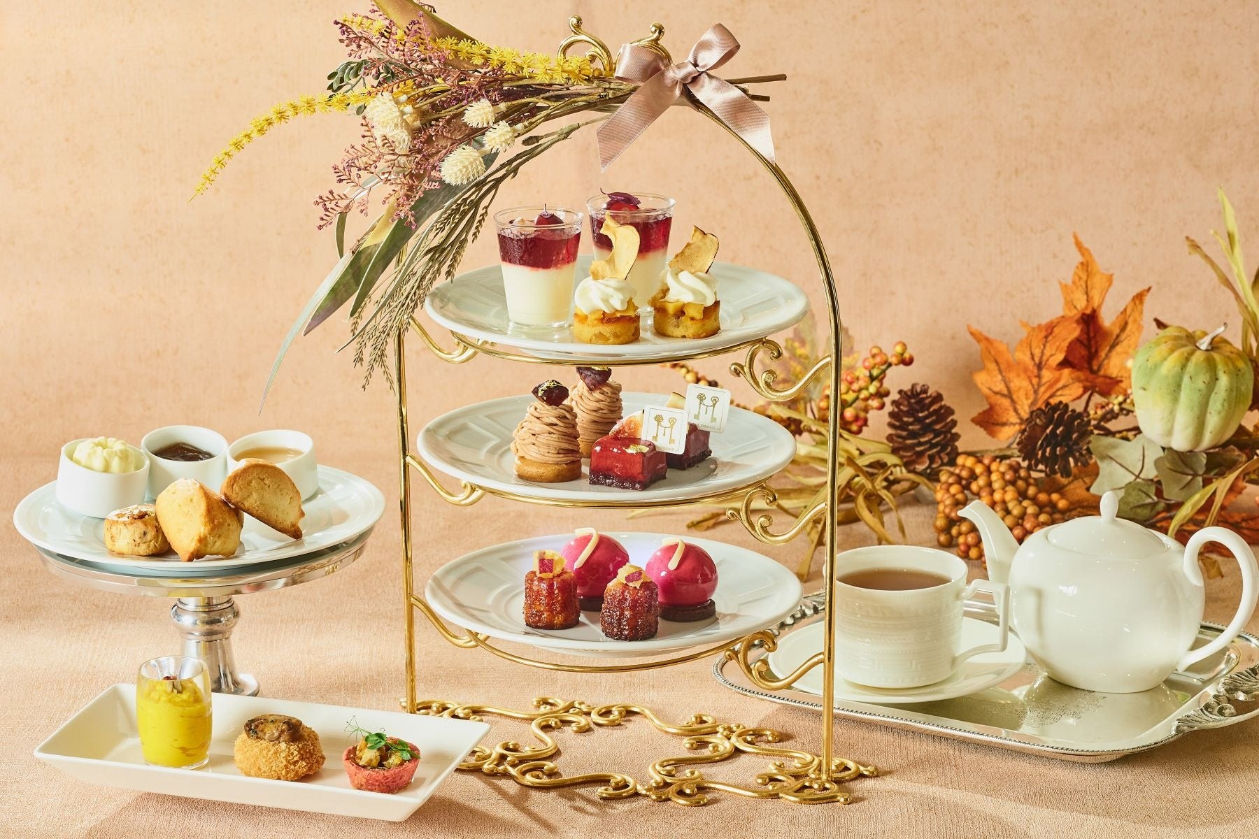 スイーツは、お化けモチーフが可愛らしいカシス香るモンブランや、ザクロとブドウのジュレ、酸味を効かせたカシスのムース、また、繊細なりんごのキャラメリゼを飾ったさつま芋のケーキ、艶やかなラズベリー色の濃厚ショコラムース、芋の甘露煮を飾ったしっとりしたカヌレなど秋の味覚を使用した計6種をご用意。特製セイボリーは、ビーツがほんのり香る牛肉のコンソメ、トリュフときのこを使い生ハムを添えた贅沢なライスコロッケ、秋の味覚の栗を使用した一口キッシュの3種をご堪能いただけます。 ※ストリングスホテル 名古屋、セントグレースヴィラはメニュー内容が多少異なります