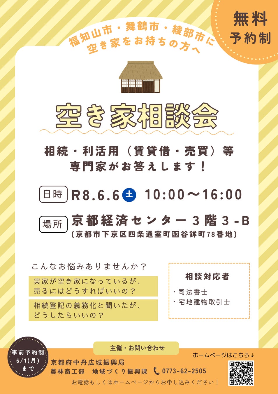 ■京都府では、地域資源の有効活用と移住促進のため、福知山市、舞鶴市、綾部市に空き家を所有する方を対象に、今後の利活用について考えていただくための相談会を京都市内で開催します。