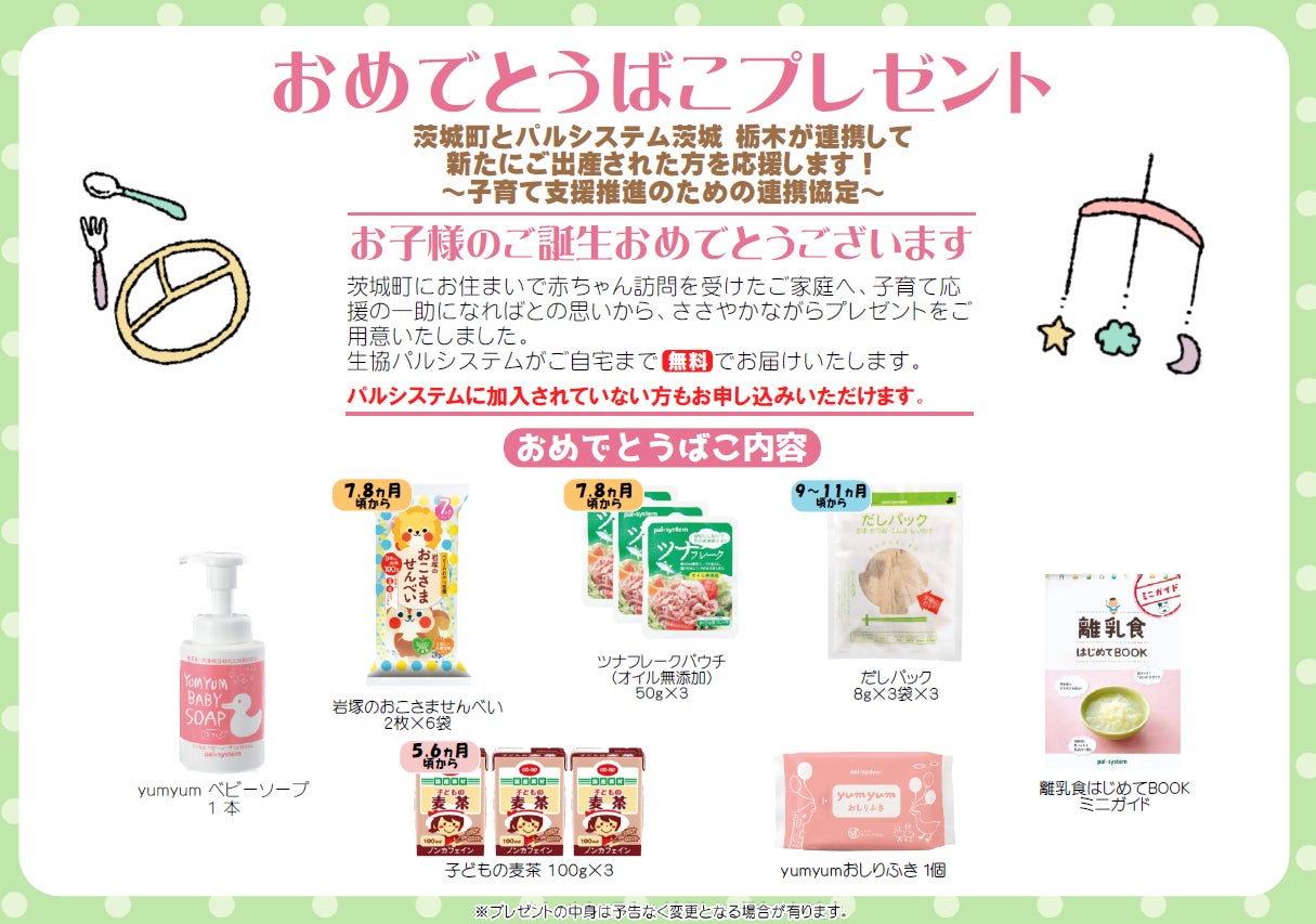 締結する「子育て支援の推進に係る連携協定」に基づき茨城町は、生後4か月までの乳児を対象とする「赤ちゃん訪問」時に、出生祝いとして育児用品を詰め合わせた「おめでとうばこ」の案内カードを配付します。出生祝いは、パルシステムが宅配サービスで届けるベビーソープやおしりふき、離乳食作りに役立つツナフレークやだしパックなどを詰め合わせます。
