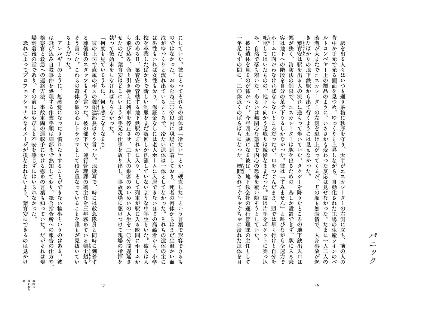 現代社会のひずみや抑圧を描いたソン・ウォンピョン『アーモンド』、ハン・ガン『回復する人間』らにも通じるストーリーテラーの初邦訳。この物語は、著者の何致和氏が来日のたび、日本の人身事故の多さに触発されて、本書が生まれたとも話し、文中にも日本の状況への言及がなされています。