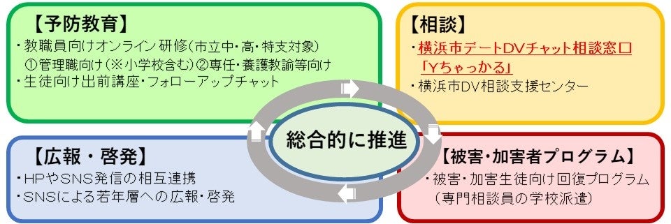 横浜市では、「第5次横浜市男女共同参画行動計画」に基づき、安全・安心な暮らしの実現に向けて、DV防止とあらゆる暴力の根絶のために、令和4年度から「デートDV防止モデル事業」を実施しています。