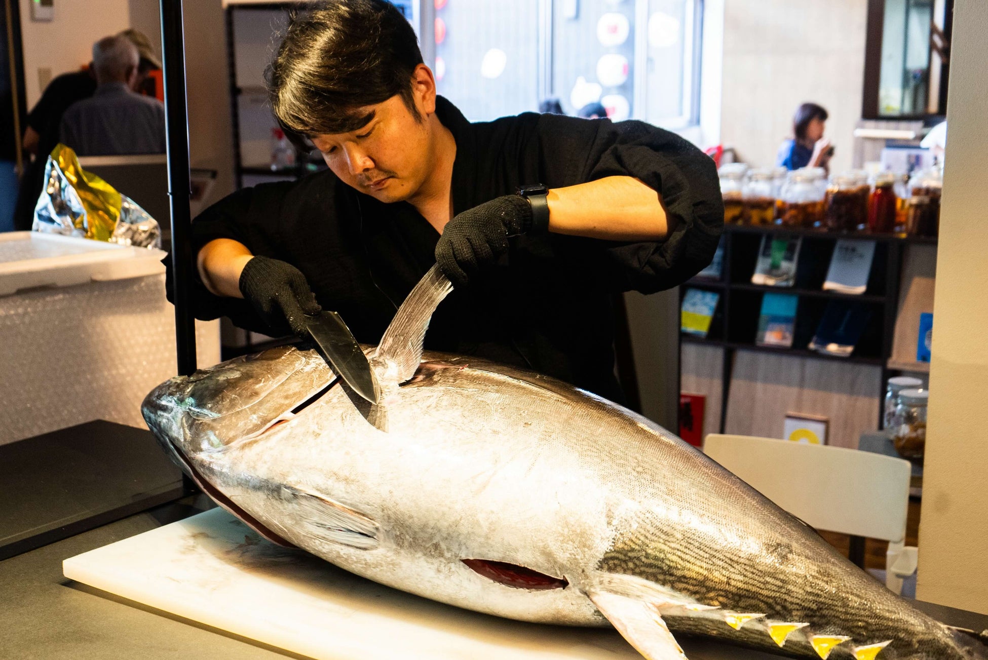 大きな本マグロをお客さまの目の前でさばきます。さばいたマグロを使った特大チラシ寿司の実演販売と豪華マグロ丼の販売も行います。