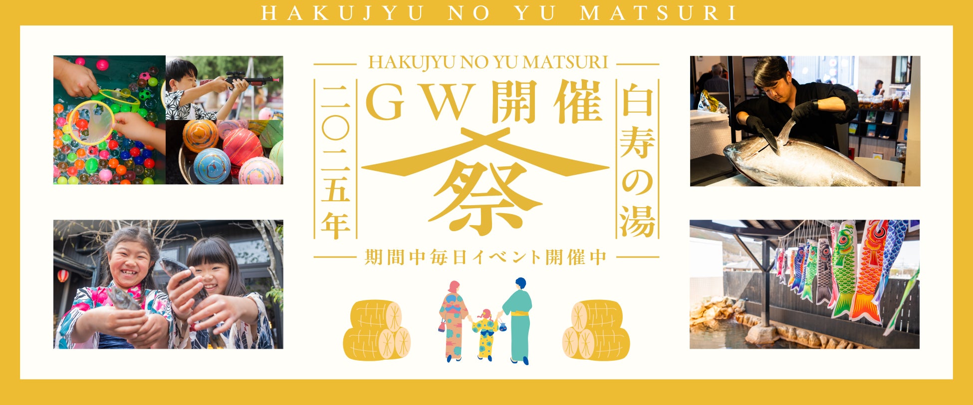 株式会社温泉道場(埼玉県比企郡ときがわ町、代表取締役 山﨑寿樹)が運営する日帰り温泉、温泉と発酵 おふろcafe 白寿の湯(埼玉県児玉郡神川町、以下 白寿の湯)は、2025年4月26日(土)から5月6日(火)までのゴールデンウイーク期間中の毎日、特別なイベントを開催します!