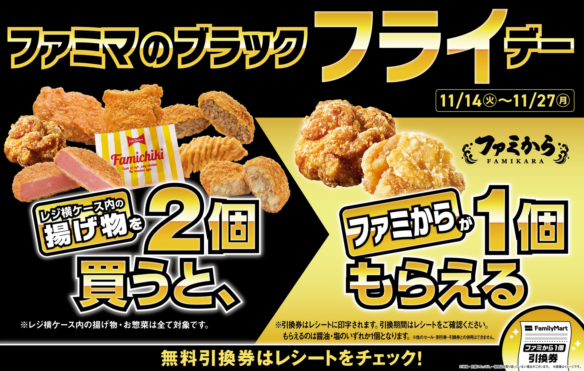 昨年実施いたしました「ファミマのブラック『フライ』デー」は多くのお客さまにご好評いただきました。今年も「ファミマのブラック『フライ』デー」を実施いたします。本キャンペーンでは期間中、レジ横ケース内の揚げ物・お惣菜の対象商品を2個買うと、「ファミから(醤油または塩)」が1個もらえる無料引換券(レシートクーポン)をお渡しいたします。