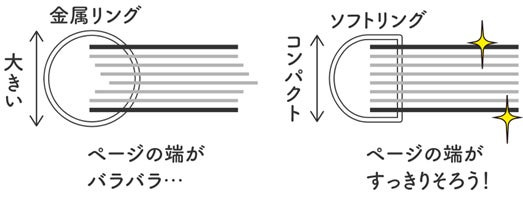 ソフトリングノートは独自に開発したオレフィン系樹脂を使ったやわらかいリングを採用しており、書くときに手に当たっても気になりにくく、複数冊重ねてもかさばりません。