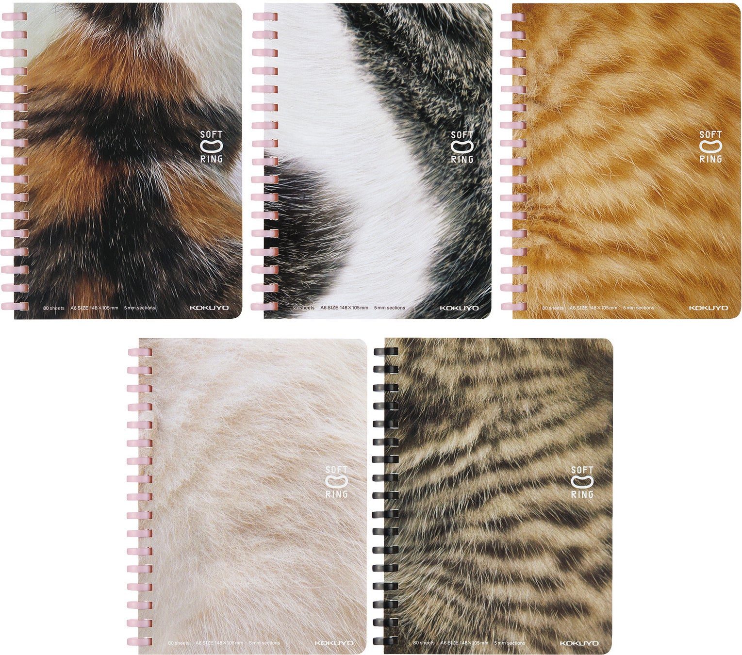 ソフトリングノートの特長であるやわらかリングを肉球に見立て、表紙に子ねこの毛並みをあしらっています。「三毛猫」「サバ白」「茶トラ」「白猫」「キジトラ」の5柄をラインアップ。サイズは子ねこをイメージしたコンパクトなA6サイズです。リングの色は肉球をイメージしたカラーで、罫線や裏表紙にも子ねこがあしらわれた可愛らしい仕様です。