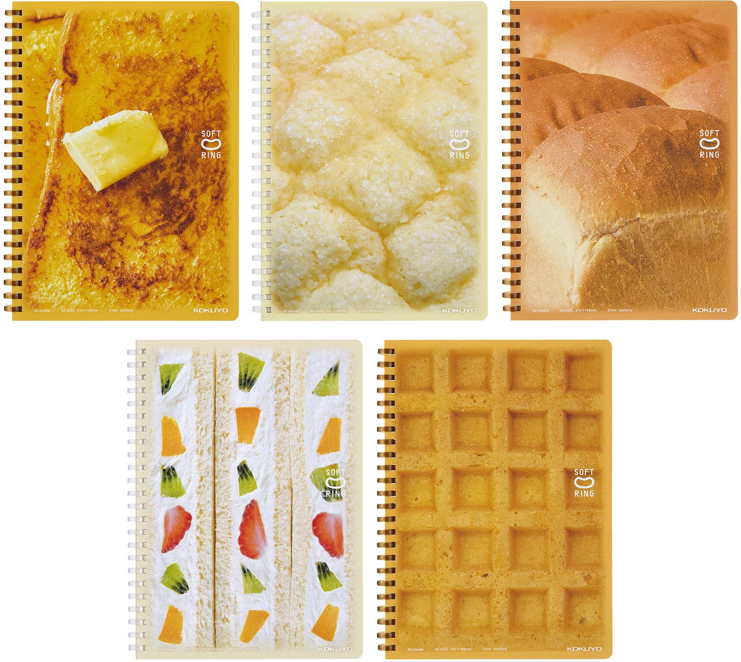 ニス加工によるシズル感のある表紙に仕上げることで、ふわふわのパンのようなやわらかさを感じられるソフトリングノートです。「フレンチトースト」「メロンパン」「食パン」「フルーツサンド」「ワッフル」の5柄をラインアップしています。<ぷにぷに子ねこ>よりも1サイズ大きいA5サイズで、ソフトリングの色はそれぞれのパン生地をイメージしています。日付欄や裏表紙にもパンがあしらわれており、開いていても閉じていても可愛い仕掛けになっています。