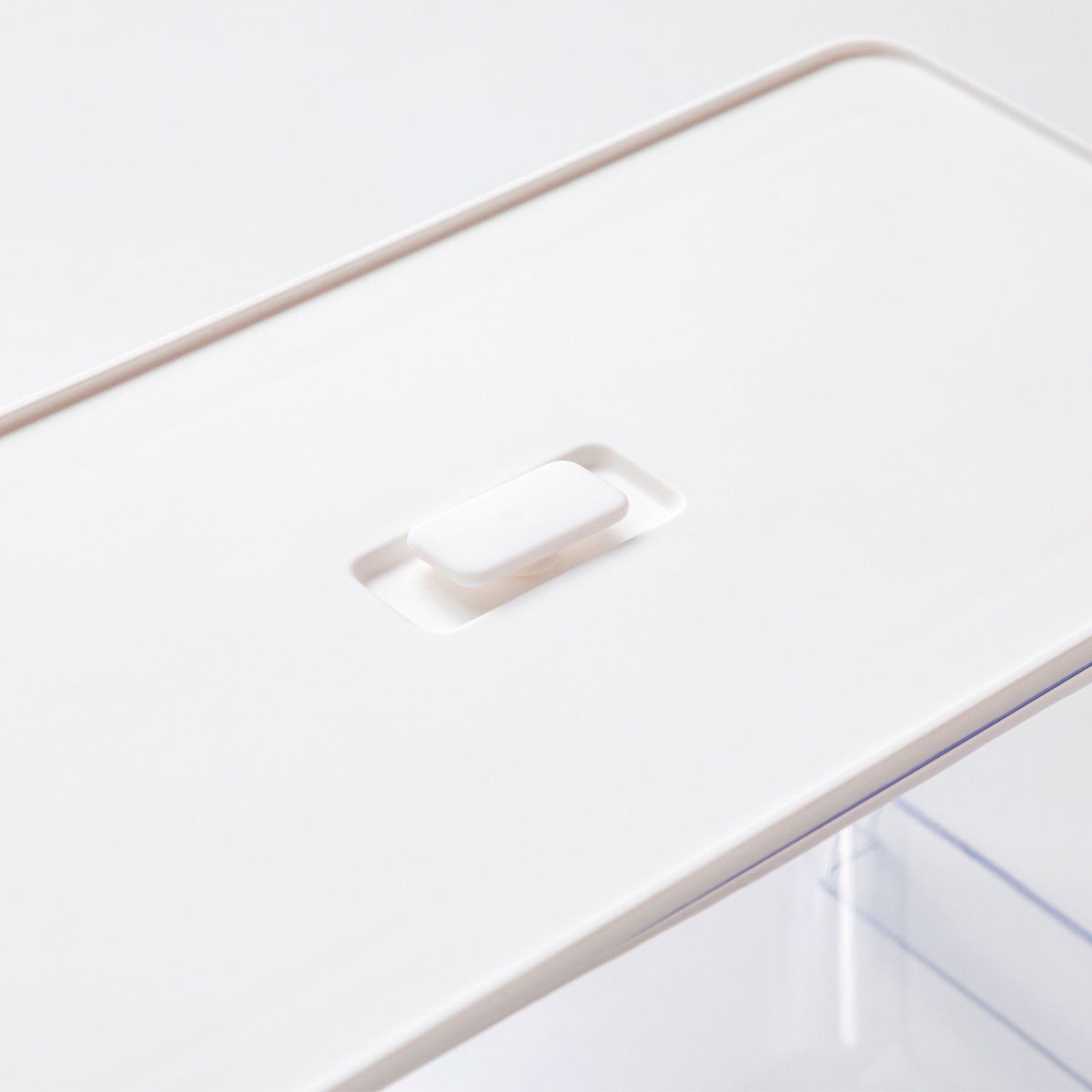 新しいニトリのドリンクサーバーは、冷蔵庫の棚にそのまま収納でき、片手でレバーを上げ下げするだけで、飲み物を注ぐことができます。レバーを倒してロックすれば、手を離しても飲み物を出し続けることも可能です。底面を傾斜構造に改善しており、残りが少なくなっても容器を傾ける必要がありません。ドリンクサーバーを使えば、水筒やボトルを取り出す毎日の手間がなくなります。日常の困りごとを解消する商品です。