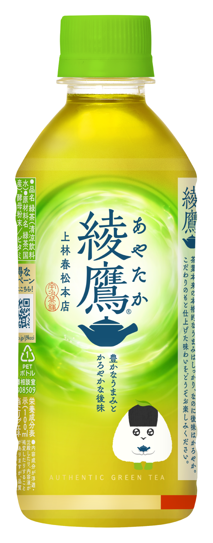 さらに、おにぎり協会認定緑茶「綾鷹」は、「あや茶丸」のデザインをあしらったパッケージデザイン※へリニューアルをし、2月2日(月)より全国にて発売します。まるで“淹れたて一杯目”のような豊かなうまみと軽やかな味わいを感じさせる従来のデザインに、思わず手にとりたくなるようなつぶらな瞳の「あや茶丸」のデザインをあしらい、製品デザインでもおにぎりとの相性の良さを提案します。