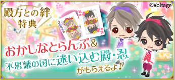 「とらんぷ」を集めて殿方に差入れすると、限定衣装を身につけた殿・忍のアバターや、部屋に飾れるインテリアアバター、アプリ内で使えるアイテムが手に入ります。殿・忍のアバターは、組み合わせることで、姿が変化