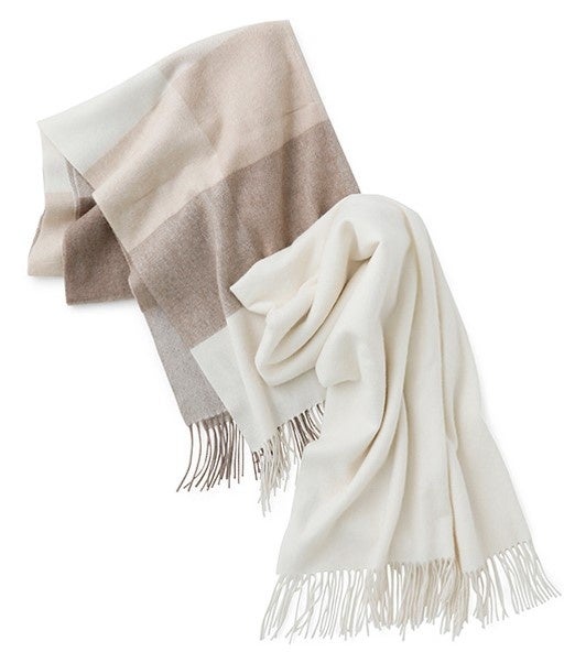 深い色が多くなる寒い時期には、思い切って淡いベージュのワントーンにチャレンジ。大判ストールが、暖かさと遊びをプラスしてくれます。パンツにはセンタープレス入りのスタイリッシュなデザインを選ぶことで、品のあるきれいめカジュアルスタイルに。