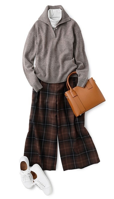 冬のトラッドスタイルと言えば、ニット+チェック柄ボトム。定番スタイルはポイントにホワイトを効かせることで、抜け感が出てマンネリ化が回避できます。今回は簡単に真似できる、タートルネックとシューズにホワイトを使い、洗練度をUPさせました。